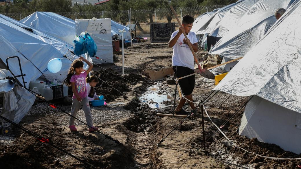 Řecká vláda a Úřad Vysokého komisaře OSN pro uprchlíky (UNHCR) postavily stany v Kara Tepe bez jakéhokoliv zpevněného podkladu, což komplikuje situaci hlavně v deštivém počasí. | Profimedia